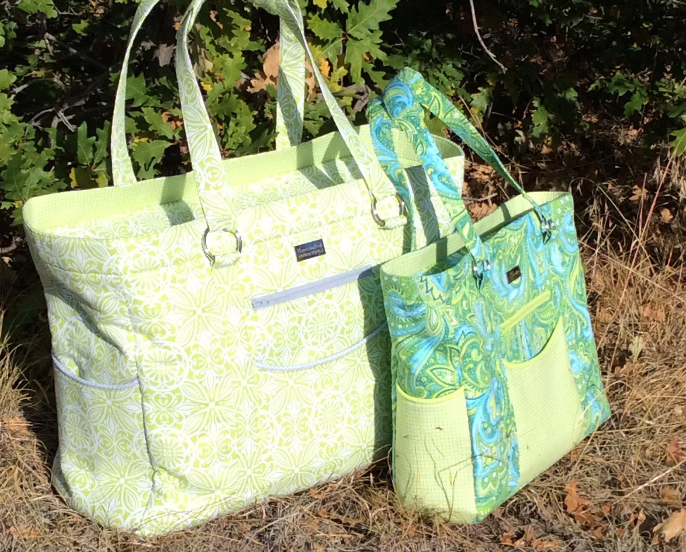 The picture below really shows the difference in size between the smaller, paisley Sidekick Tote and the larger, Megan Travel Tote.